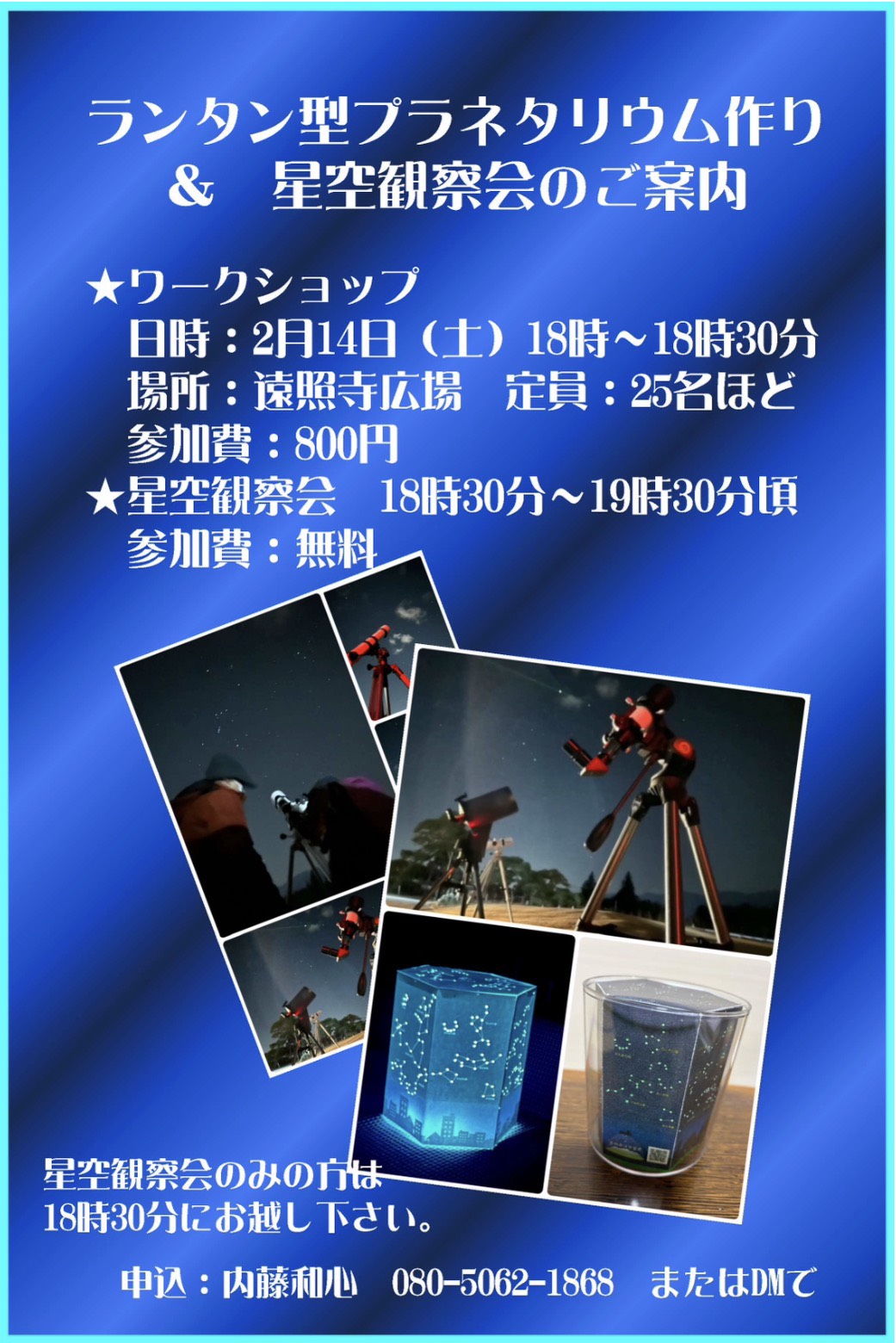恒例の星見里の会の皆様による星空観察会です。今回はランタン型プラネタリウムを作るワークショップをしてから観察会を行います。大人も子どもも星の世界をより身近に感じていただけると思います。雨天の場合はワークショップとスライドショーの上映を行います。暖かい恰好でお越しください。